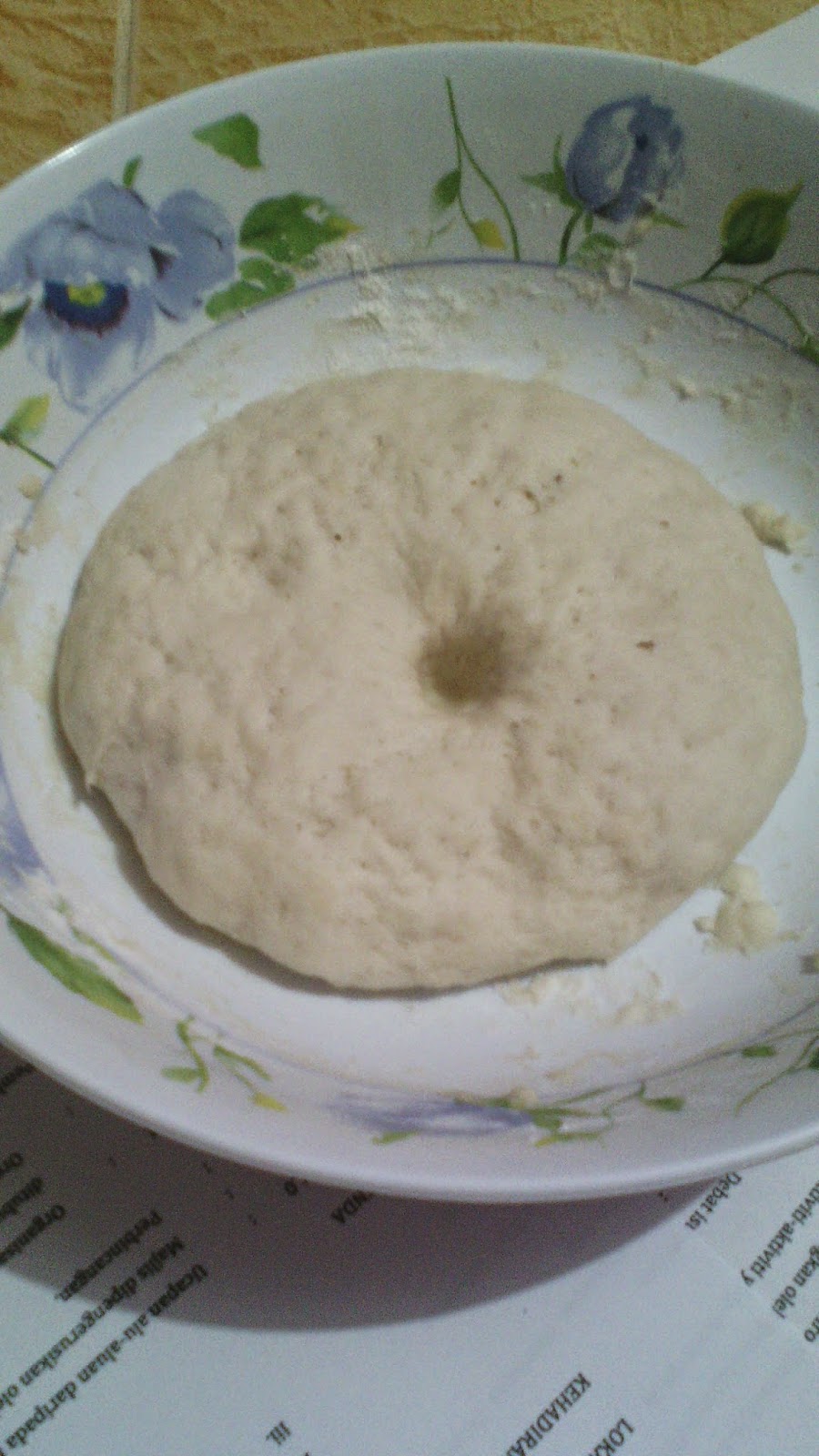 Campurkan je semua bahan untuk buat doh tu . ha..tapi makesure serbuk yis tu dibancuh dgn air suam dulu . then uli sume bahan tersebut smpailah doh tak melekat dekat tangan . kemudian , rehatkan doh selama 40 minit . lepas direhatkan doh akan mengembang mcm nie :